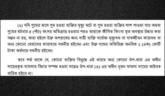 জারি করা গেজেটে গুমের ধরন ও শাস্তি সম্পর্কে স্পষ্টভাবে আইন ও বিধিবিধান তুলে ধরা হয়েছে।