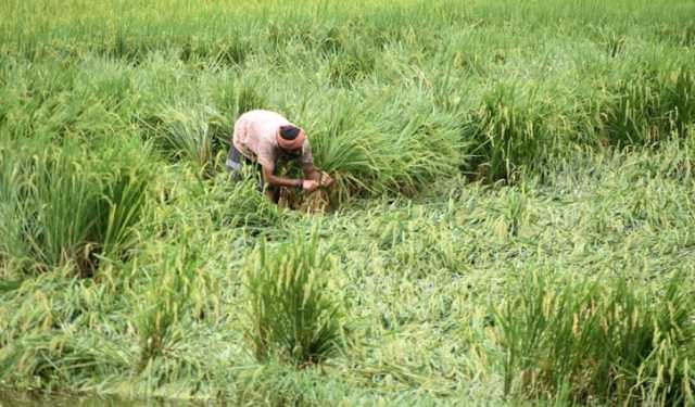 ক্ষেত থেকে শুয়ে পড়া ধান কাটছেন এক কৃষক