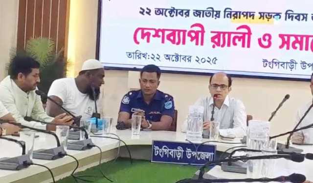 মুন্সীগঞ্জ: জাতীয় নিরাপদ সড়ক দিবস উপলক্ষে জেলার টঙ্গীবাড়ী উপজেলা পরিষদের হল রুমে আলোচনা সভা অনুষ্ঠিত হয়েছে। সকাল ১১টায় এ সভা অনুষ্ঠিত হয়। এর আগে, টঙ্গীবাড়ী থানার প্রধান ফটক থেকে র্যালি বের হয়। সেটি গুরুত্বপূর্ণ সড়ক প্রদক্ষিণ করে উপজেলা পরিষদের গেটে গিয়ে শেষ হয়।