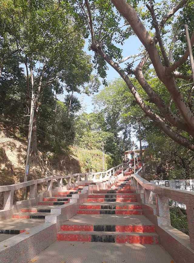 গেটের বাইরে দুপাশে নানা পণ্যের দোকান। কিছু দোকানের সামনে মাটির পাত্রে লাল জবাফুল, কমলা, শসা, বেল, কলাসহ নানা ফল সাজানো। মূলত মন্দিরে আসা পুণ্যার্থীরা প্রার্থনার জন্য ফল সাজানো এ পাত্র কিনেন। এ ছাড়া গেটের দুপাশে আছে আদিবাসী রাখাইনদের তাঁতে বোনা সালোয়ার-কামিজ, লুঙ্গি, শাল, ওড়না, গামছা, রুমালসহ বিভিন্ন তাঁতসামগ্রীর দোকান। আমরা মন্দিরে পূজা দেওয়ার নিমিত্তে পূজার সামগ্রী কিনে নিলাম।