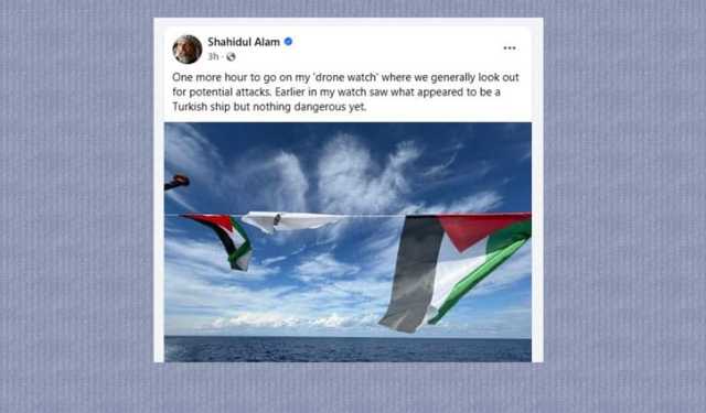 এই বহরে থাকা একমাত্র বাংলাদেশি আলোকচিত্রী শহিদুল আলম বুধবার সন্ধ্যায় নিজের ফেসবুকে লিখেছেন, “আমার ‘ড্রোন ওয়াচ' দেখাচ্ছে- আরো এক ঘণ্টা যেতে হবে, যেখানে আমরা সাধারণত সম্ভাব্য আক্রমণের প্রতি নজর রাখি। আমার ওয়াচে এর আগে একটি তুর্কি জাহাজ দেখা গেছে, তবে এখন পর্যন্ত বিপজ্জনক কিছু ঘটেনি।”