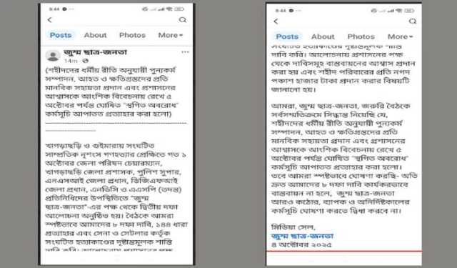 শনিবার (৪ অক্টোবর) সকালে তাদের ফেসবুক পেইজে দেওয়া এক বিবৃতিতে এ অবরোধ প্রত্যাহারের ঘোষণা দেয় জুম্ম ছাত্র-জনতা।