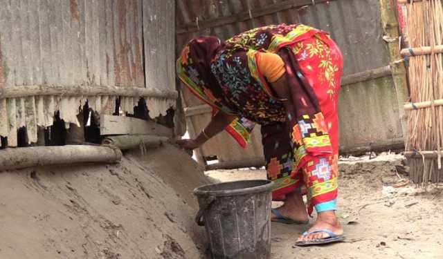 মাটি দিয়ে ঘরের ফাঁকা হয়ে যাওয়া স্থান পূরণের চেষ্টায় এক নারী