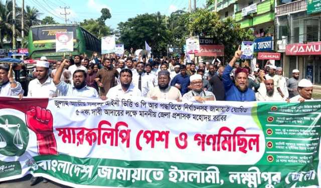 লক্ষ্মীপুর: রবিবার সকালে লক্ষ্মীপুর প্রেস ক্লাবের সামনে থেকে গণমিছিল বের করে জামায়াতে। মিছিল শেষ তারা অতিরিক্ত জেলা প্রশাসক সম্রাট খীসার মাধ্যমে প্রধান উপদেষ্টা বরাবর স্মারকলিপি দেন।