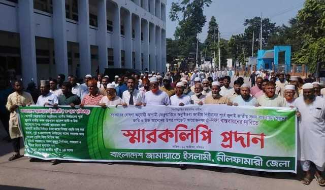 নীলফামারী: সকাল সাড়ে ১০টার দিকে জেলা জামায়াতের কার্যালয় থেকে মিছিল বের হয়ে জেলা প্রশাসক কার্যালয়ের সামনে গিয়ে শেষ হয়। পরে জামায়াত নেতারা জেলা প্রশাসক মোহাম্মদ নায়িরুজ্জামানের মাধ্যমে অন্তর্বর্তীকালীর সরকারের প্রধান উপদেষ্টা বরাবর স্মারকলিপি দেন।