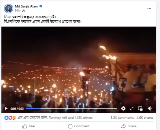 সারজিস আলম তার পোস্টে বিএনপিকে ধন্যবাদ জানানোর মধ্য দিয়ে তিস্তা মহাপরিকল্পনা ইস্যুটিকে জাতীয় পর্যায়ে গুরুত্ব দিলেন। তিনি তার পোস্টে লেখেন, “তিস্তা মহাপরিকল্পনার বাস্তবায়ন চাই। বিএনপিকে ধন্যবাদ এমন একটি উদ্যোগ গ্রহণের জন্য।”