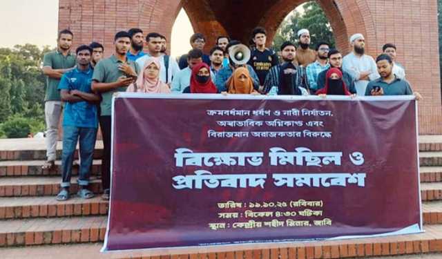 আহ্বায়ক জহির উদ্দিন মোহম্মদ বাবর বলেন, “সাভারে বিউপি শিক্ষার্থী গণধর্ষণের প্রতিবাদে এই কর্মসূচির আয়োজন করা হয়েছে। গত ১৭ বছরের বিচারহীনতার কারণে দেশে ধর্ষণ ও অন্যায়-অনিয়ম অব্যাহত ছিল। জাবিতে ছাত্রলীগের মানিক এবং কিছুদিন আগে মোস্তাফিজ ধর্ষণ করেছিল। জুলাই পরবর্তী সময়ে ইন্টেরিম সরকারের মাধ্যমে আমরা পরিবর্তনের স্বপ্ন দেখেছিলাম। কিন্তু এ সরকারও নারীদের নিরাপত্তা, ন্যায়বিচার ও আইন-শৃঙ্খলা উন্নতি করতে পারেনি। আমরা চাই, অনতিবিলম্বে সাভারের ঘটনায় জড়িতদের আইনের আওতায় এনে ফাঁসি কার্যকর করতে হবে।”