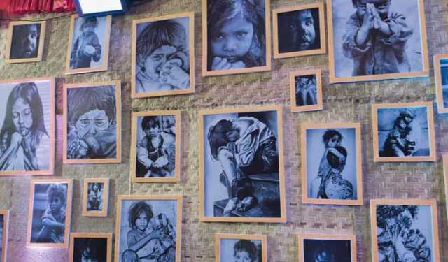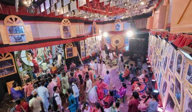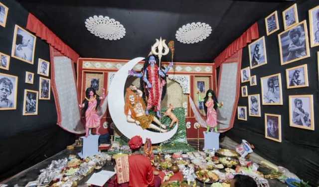 মণ্ডপের চারপাশে টানানো দুই শতাধিক ছবিতে ফুটে উঠেছে গাজার ধ্বংসস্তূপে হারিয়ে যাওয়া শৈশব। কেউ কাঁদছে ধোঁয়ার মধ্যে, কেউ খুঁজছে হারানো মা-বাবাকে। আলোর ঝলকানির মধ্যে দেখা যায় সেই ছবিগুলোর ভয়ার্ত মুখ। কালীমূর্তির চারপাশে সাজানো হয়েছে এই সকল শিশুদের ছবি।