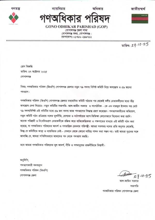 বিজ্ঞপ্তিতে উল্লেখ করা হয়েছে, গণঅধিকার পরিষদ (জিওপি) গোপালগঞ্জ জেলার নবঘোষিত কমিটি গঠনের পর থেকেই দলীয় নেতাকর্মীদের মধ্যে তীব্র অসন্তোষ দেখা দিয়েছে। সভাপতি আল-আমীন সরদার ও সাংগঠনিক কে এম নাজমুল ইসলামসহ মোট ৭৯ সদস্যবিশিষ্ট এই কমিটির মধ্যে ৫৯ জন সদস্য পদত্যাগের সিদ্ধান্ত নিয়েছেন।