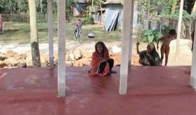 নির্মাণাধীন ঘরের বারান্দায় বসে আছেন মেহেরুন নেছা