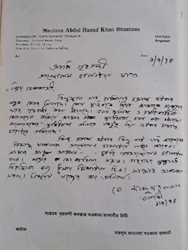 মওলানা আব্দুল হামিদ খান ভাসানীর হাতে লেখা চিঠি