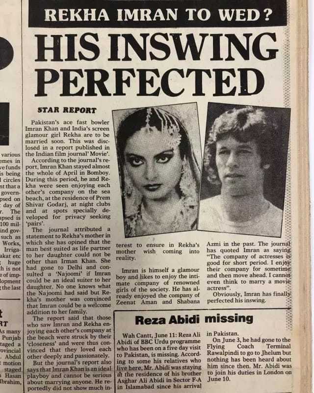 আশির দশকে রেখা ও ইমরান খানের প্রেমের সম্পর্কের গুঞ্জন শুরু হয়। এ জুটিকে বহুবার একসঙ্গে দেখা গিয়েছে। তাদের প্রেমকাহিনি গ্ল্যামার ও ক্রিকেট জগতে প্রচণ্ড আলোচনা তৈরি করেছিল। সেই সময়ে খবর প্রকাশিত হয়েছিল, রেখা ও ইমরান একসঙ্গে মুম্বাইয়ের সমুদ্রসৈকতে সময় কাটাতেন। কেবল তাই নয়, শুটিংয়ের সময়ও রেখাকে দেখতে যেতেন ইমরান।